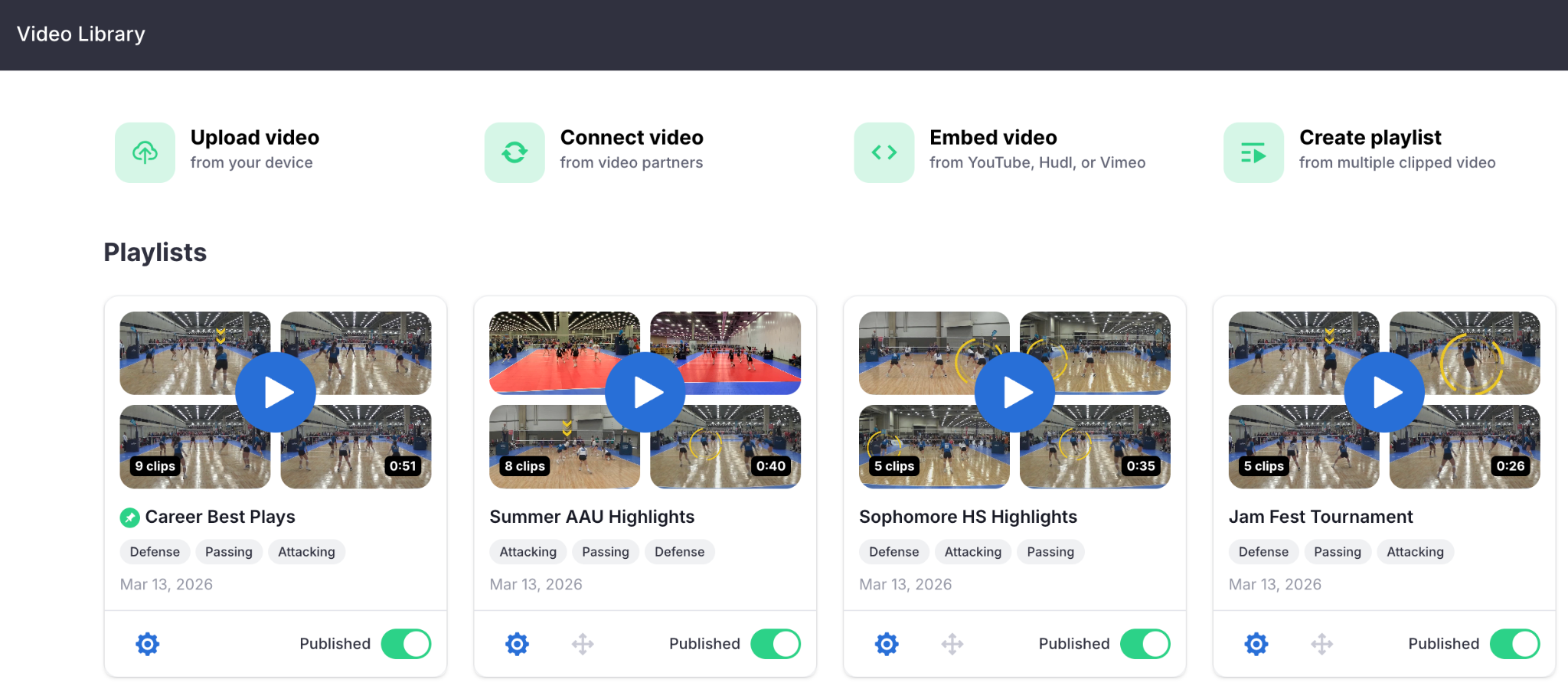 In the Video Library, athletes can manage any of their existing playlists. They can publish and unpublish playlists, determine the order in which the playlists appear on the Athlete Profile, and select which playlist is pinned.