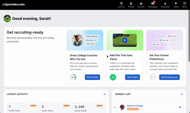 Recruiting can feel overwhelming, especially if you're navigating it for the first time. The Athlete Dashboard was built to give you clear next steps at every stage, help you focus on actions that drive college coach exposure, and provide timely insights so nothing slips through the cracks.
